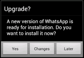 and accompanied with the empty file called WhatsApp.upgrade in the same directory. The next time WhatsApp starts it will look for these files, and if both are present display a dialog asking if the user wants to install the update:
