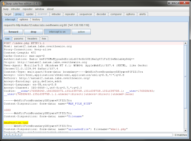 We browse to the file using the URL [filename].php?cmd=cat /etc/natas_webpass/natas13, and we receive the following: