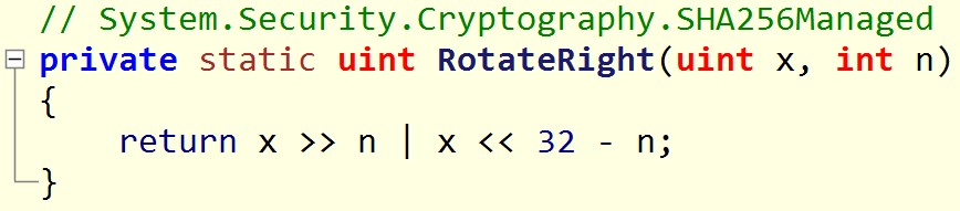 Nearly all .NET methods are comprised of an array of CIL instructions and arguments to the instructions. These instructions are all thoroughly documented. CIL instructions manipulate values on what is referred to as the evaluation stack. CIL instructions can push values onto the stack, pop them off the stack, and perform operations on the values at the top off the stack. Let’s see this in action. For this example, we’re going to analyze a .NET method that implements a bitwise right circular shift – System.Security.Cryptography.SHA256Managed.RotateRight(uint x, int n).
