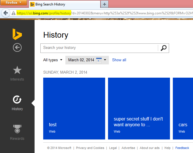 So really, I was only able to really exploit the overly permissive crossdomain.xml file and gain access to the sensitive information because the application sent the sensitive history information to authenticated users, even when they requested the data from www.bing.com/profile/history. If Bing told authenticated users to use ssl.bing.com/profile/history or get lost, I would not have had a very exciting demo.