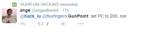 Hack.lu’s 2014 CTF took place on October 21-23. The event was organized by fluxfingers, and this year’s challenges were really enjoyable, huge props to them. I played with my friends from TheGoonies – after winning the Brazilian CTF Pwn2Win we are now getting better organized to become more competitive. There are quite a few write ups around and I decided to post about a few tasks which we had a different solution from other teams.