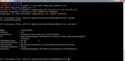 Now, lets see how we can use one very useful PowerShell shell to get a reverse connect. Though Go may not be one of the best tools to show this demo due to the lack of its public instance, lets use only ICMP communication to get a reverse shell. We will use Invoke-PowerShellIcmp from Nishang. This reverse shell communicates completely over ICMP and needs a listener on Linux from the icmpsh suite. See my earlier blog post detailing its use here. After setting up the listener, we will modify Invoke-PowerShellIcmp to remove help contents and make the function call from the script itself, now we can use Invoke-Encode from Nishang to compress and base64 encode it. Now, it could be used in the custom command as below: