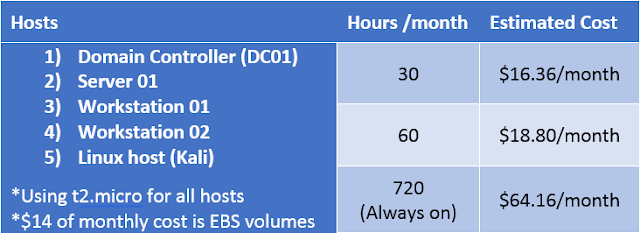 These are just estimations. You can save money by choosing a smaller volume size at instance creation, keeping your Kali instance local, and by tearing down and rebuilding some or part of the environment if you feel like you don’t need it for a few months.