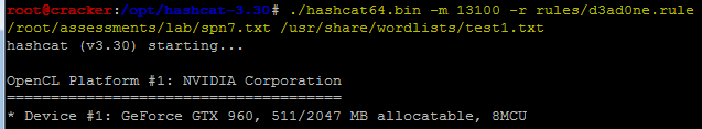 root@cracker:/opt/hashcat-3.30# ./hashcat64.bin -m 13100 -r rules/<rules_file> <path to hashes file> <path to wordlist>