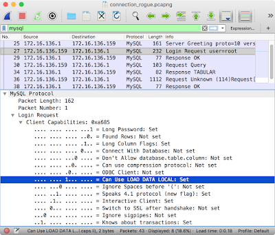 After the successful authentication, the client sends the query and waits for the server response before actually doing something. The “Client Capabilities” packet includes an entry called “Can Use LOAD DATA LOCAL”.