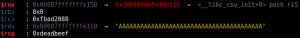 In this case, this will cause the program to crash, because we just modified the stack pointer to point to the address 0xdeadbeef, which isn’t valid. However, we can see that we’ve achieved control of rsp indirectly through the