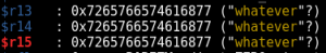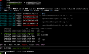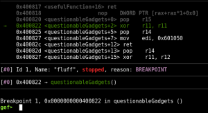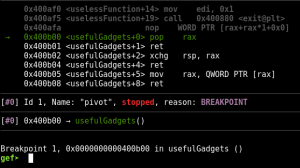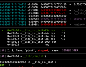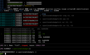 As you can see in the above code, we’ll pivot the stack to 0x7ffff7836f10 and continue execution there, which will involve placing the string “whatever” into r13, r14 and r15 and then proceed by calling another function. Let’s try making use of a breakpoint so we can see the stack pivot.