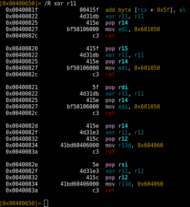 To clear out a value held in a register (which can be helpful if you need a register to be empty for some operation later on), try to find a gadget that’ll XOR that register against itself (since if you XOR anything against itself, you get 0). For example, let’s try searching for a useful