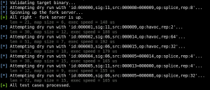 In a normal run of AFL, the purpose of this step is to sanity check the test cases you’ve provided to make sure they don’t result in a crash. AFL wants clean test files that will cause the program to behave as expected so that it can begin iterating on them to trigger unusual behavior.