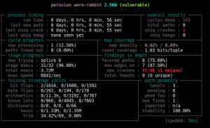 Note that the name displayed at the top is “peruvian were-rabbit”, which is the name used for the crash exploration mode. Also note the massive number of crashes — I have 97.0k after nearly nine minutes of fuzzing. However, the single unique crash is the one we’re interested in, since it’s an iteration on a previous one that has now triggered some new code path. Upon generating enough of these crashes, we could begin to compare the different crash iterations to see what’s changed. The crash exploration mode can be useful in determining which crashes will likely be most remunerative to study in greater detail.