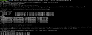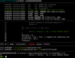 Also note that I still have access to the GEF plugin for GDB; rr is an enhancement for GDB, but doesn’t replace it. By typing “c” to continue (just like in a regular debugging session), you can continue to the point at which the binary crashed.