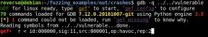 First, let’s make sure we can reproduce one of these crashes by opening the fuzzed binary again in GDB and piping the crash file as input to the run command (the vulnerable binary expects input from stdin).