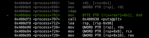 We’re currently on the instruction located at *process+702. Now, let’s go back a couple of instructions by using rr’s reverse-step functionality. Just run the command “reverse-step” several times (for some reason, I have to initially run any “reverse” command twice to start moving backward; I’m not sure why).