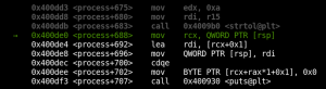 We’ve now time-traveled into the past! Notice that we’re several instructions back now, at *process+688. Our next step back would take us into the strtol() function, which we may not be interested in debugging. To step over it back to *process+680, we can use the “reverse-next” command.