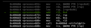We’ve skipped over the strtol() function, just as we would with a “next” instruction while performing normal debugging.
