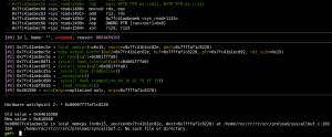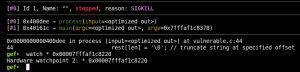 Watchpoints can be combined with rr to great effect. Let’s say we’re interested in knowing when the address 0x00007fffaf1c8220 has its content changed. We also want to know when that happened most recently before the crash. To find out, let’s first type “c” to continue execution forward again and arrive at the crash. Next, let’s configure a watchpoint on that address by running the following command:
