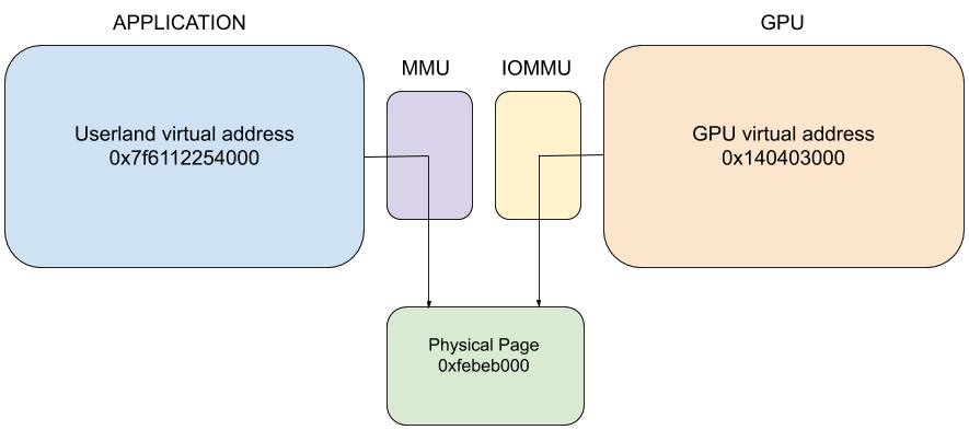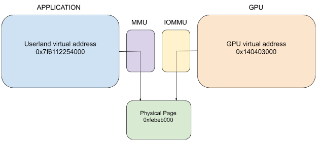 The other is the view from the GPU hardware itself, which uses a GPU virtual address. The GPU virtual address is chosen by the KGSL kernel driver, which configures the device’s IOMMU (called the SMMU on ARM) with a page table structure that is used just for the GPU. When the GPU tries to read or write the shared memory mapping, the IOMMU will translate the GPU virtual address to a physical page in memory. This is similar to the address translation performed on the CPU, but with a completely different address space (i.e. the pointer value used in the application will be different to the pointer value used in the GPU).