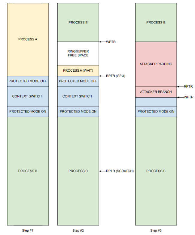 The typical pattern for protected mode operations is to 1) drop protected mode, 2) perform some privileged operations, and 3) re-enable protected mode. Therefore, to recover the attack, we can perform a race condition between steps 1 and 3. We can start the execution of a privileged operation such as a GPU context switch, and while it is still executing on the GPU with protected mode disabled, we can overwrite the privileged operations using the RPTR ringbuffer corruption primitive, essentially replacing the GPU context switch with an attacker-controlled indirect branch.