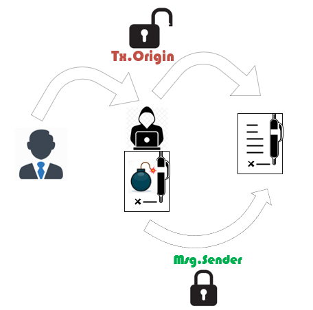I hope that clears up any confusion as to the difference between both msg.sender and tx.origin. We will now take a look at a more comprehensive example with a bit of vulnerable code to put this into context and show how to bypass some controls using this attack method.