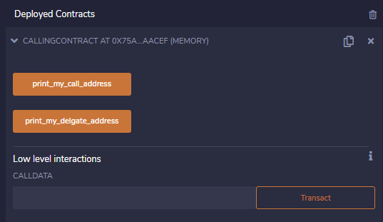 After you deploy the contract you will want to take note of the address of the CallingContract. In this example above the buttons you will see the calling contract address starts with the values 0x75A. Write the address of your contract down, as this contract address will be important when reviewing the output of the two functions print_my_call_address and print_my_delegate_address.