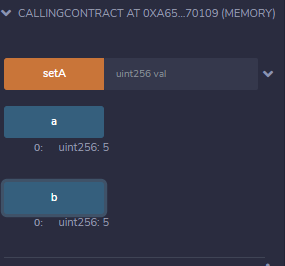 Then we click the setA button to execute the delegatecall into the set function in the logic contract and this results in “a” remaining at the value of 5 but “b” is updated to the value placed in the setA function. In this case I used the value of 3.