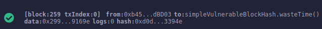 So, what happens when we calculate a block after a time lapse? Let’s give that a try by executing the wasteTime button till we reach block 259. Waste time sets a block value and discards it to enumerate blocks for us, it doesn’t actually make any real changes. Normally blocks on the Ethereum network enumerate on their own every 30 seconds and we would simply just wait for 256 blocks, but we don’t have traffic on our blockchain so we will enumerate it ourselves with wasteTime.