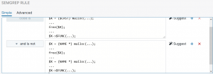 Here we’re using a metavariable so we can easily track an allocated object and identify later operations on it. We’re also using the ellipses operator so that we can identify uses of malloc() regardless of the exact format the parameters take; for example, this way our pattern will flag on both malloc(sizeof(something)) and malloc(16) (or any other fixed size).