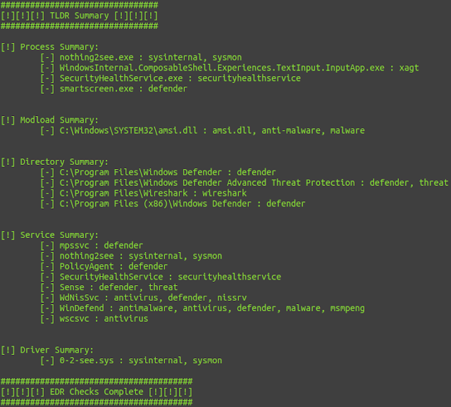 New and improved C# Implementation of Invoke-EDRChecker. Checks running processes, process metadata, Dlls loaded into your current process and each DLLs metadata, common install directories, installed services and each service binaries metadata, installed drivers and each drivers metadata, all for the presence of known defensive products such as AV’s, EDR’s and logging tools. Catches hidden EDRs as well via its metadata checks, more info in a blog post coming soon.
